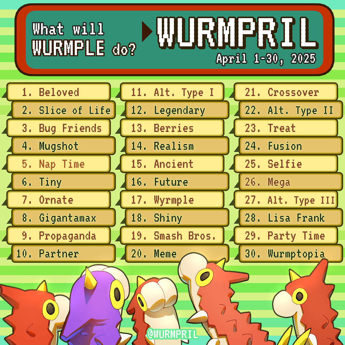 April 1 - 30, 2025Join us for a casual month-long online art event appreciating our favorite Pokemon, Wurmple!Celebrate YEAR ONE of WURMPRIL!